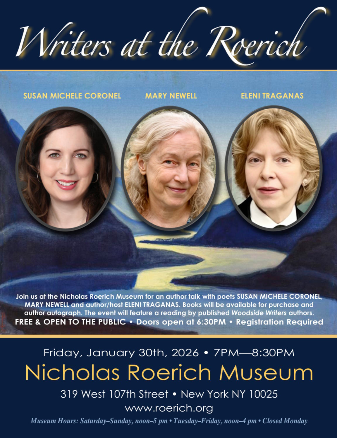 Join us at the Nicholas Roerich Museum for an author talk with poets Susan Michele Coronel, Mary Newell, and author/host Eleni Traganas. Books will be available for purchase and author autograph. The event will feature a reading by published Woodside Writers authors.